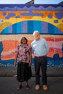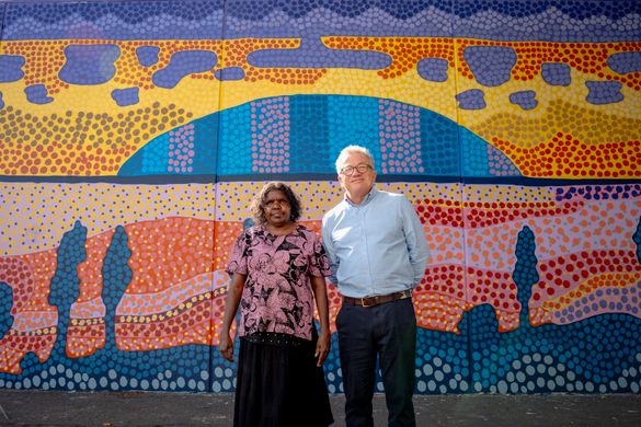Created to celebrate Field of Light's 10th anniversary, the 25m long mural is a collaboration between two Indigenous artists; Wurundjeri muralist Alex Kerr and Aṉangu artist Valerie Brumby (Uluṟu Traditional Owner of Walkatjara Art Centre) - who travelled thousands of kilometres from the Red Centre to bring the project to life.