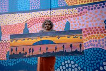 Aṉangu artist Valerie Brumby says: “Doing this artwork, painting the sunset over the Field of Light makes me feel happy and proud. This is good for the tourists to see, and we are making a mural to show everyone how beautiful it is.”